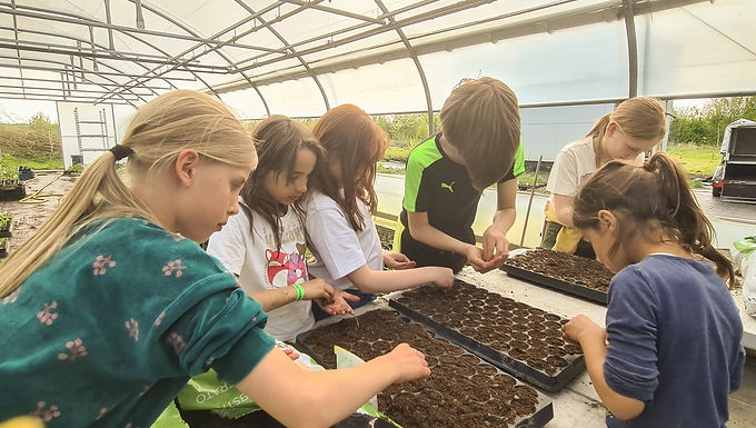 • Natuurlijk steken we ook de handen in de aarde en verpotten, zaaien, planten we in de tuin van de kwekerij!