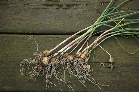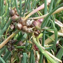 Krullende bloemstelen met broedbolletjes. Historisch keukenkruid.